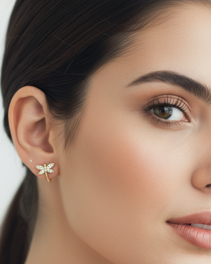 Inspirados en la delicadeza y fuerza de la libélula, estos aros enchapados en oro representan transformación, claridad espiritual y renacimiento interior. Las alas con brillo sutil evocan la conexión con la luz, ideales para quienes transitan procesos de cambio profundo o desean honrar su crecimiento personal.