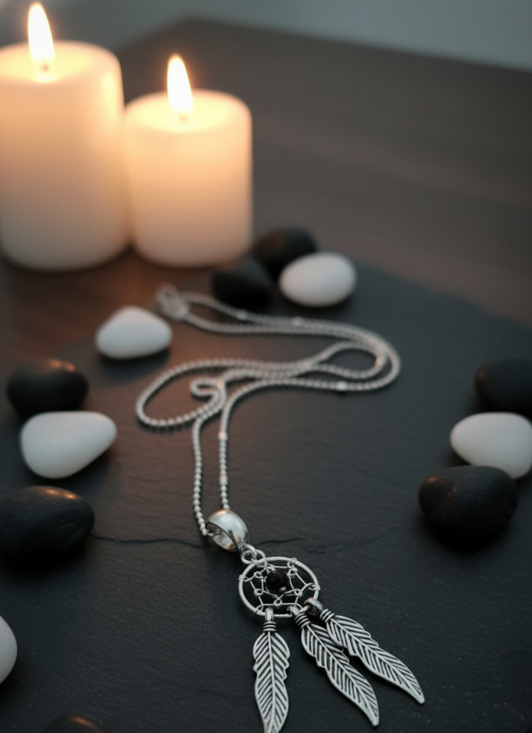 Este fino collar está elaborado en plata italiana 925 y presenta un delicado dije en forma de atrapasueños, símbolo de protección espiritual y guía interior.